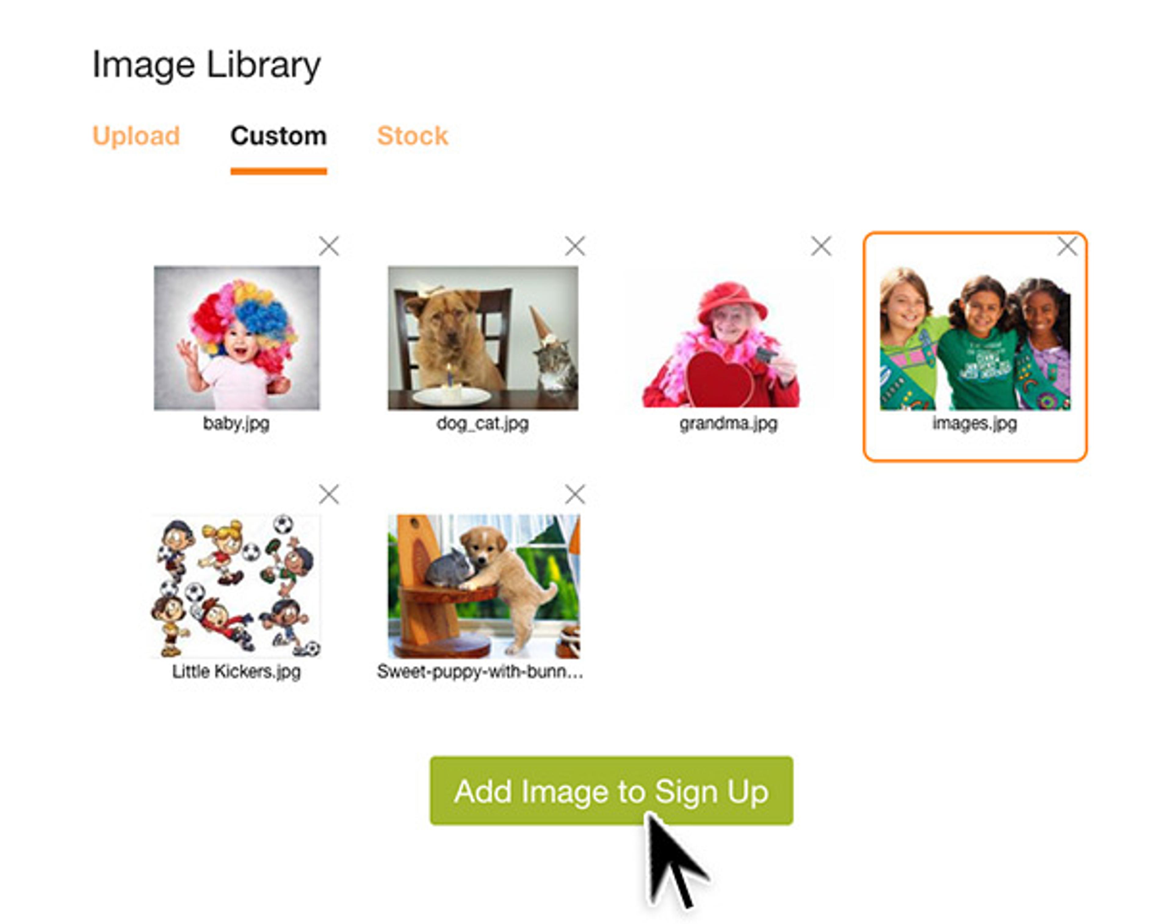 - Click Upload to either drag and drop your custom image or choose Click Here to upload the image from your computer. Click Custom to select from images you have already uploaded. Choose your image and click Add Image to Sign Up.