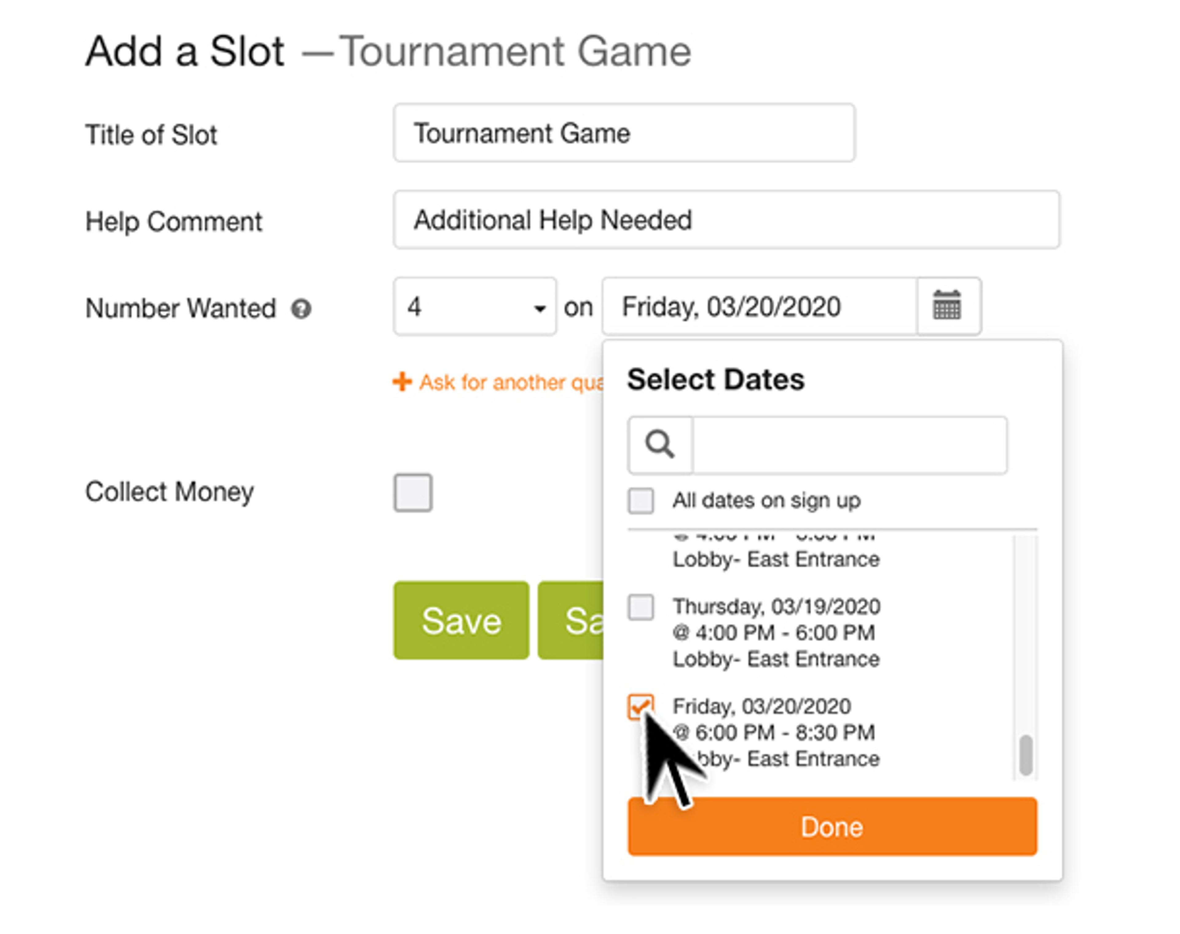 Click Done and then click the green Save button to assign your slot to the date(s) selected.