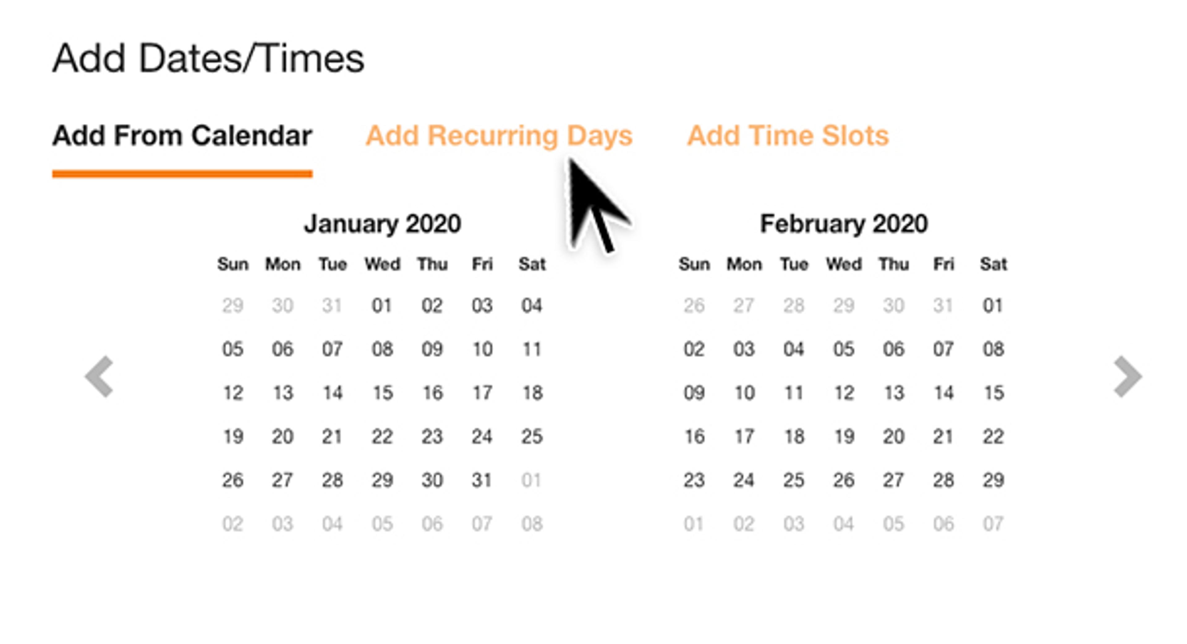 After selecting the Add Dates button, you will see three options: Add from Calendar, Add Recurring Dates and Add Time Slots.