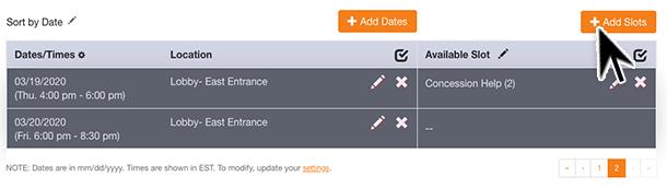 Notice that the new date does not have a slot assigned. In order for the new date to show on the live sign up, you will need to assign a slot to that date. Click Add Slots.