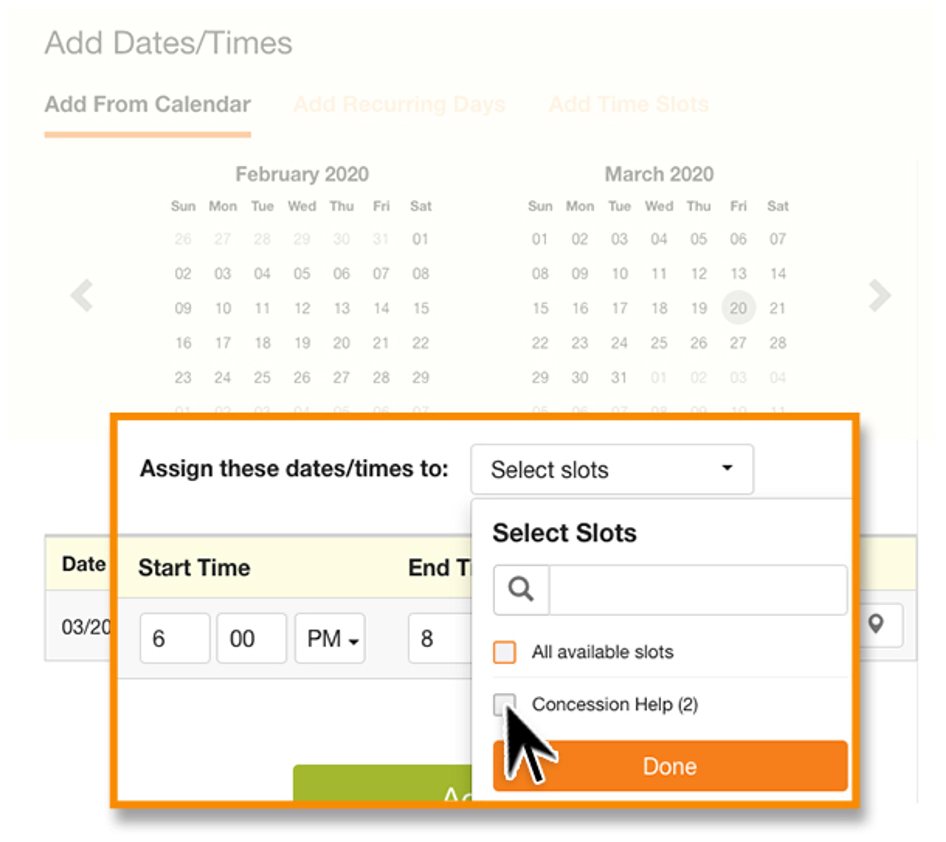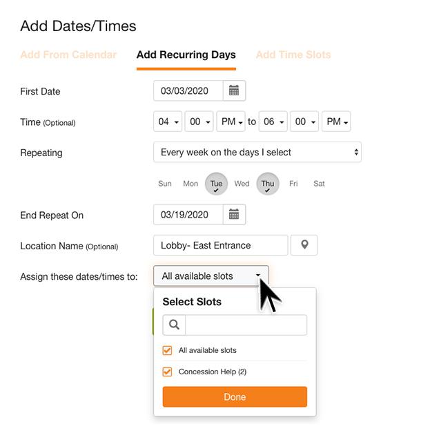 Click Done and then click Add Dates which will add new dates/times and assign the dates and times to an existing slot.