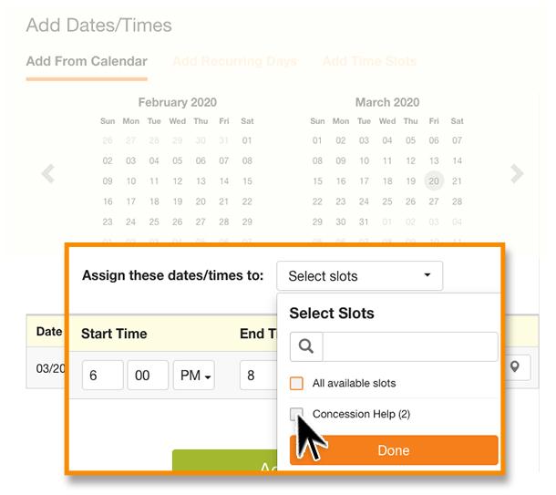 The default setting will assign the newly added dates/times to All available slots. If the dates and times do not apply to all available slots, you will un-check 'All Available Slots' and assign only to the slots applicable to those dates/times. Here, I am choosing to assign the newly added dates/times to the existing slot for Concession Help (2).